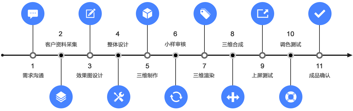 深工裸眼3D視頻素材定制的基本服務流程如下圖所示,素材定制周期根據(jù)客戶需求及建模難度,制作周期約30-60個工作日。