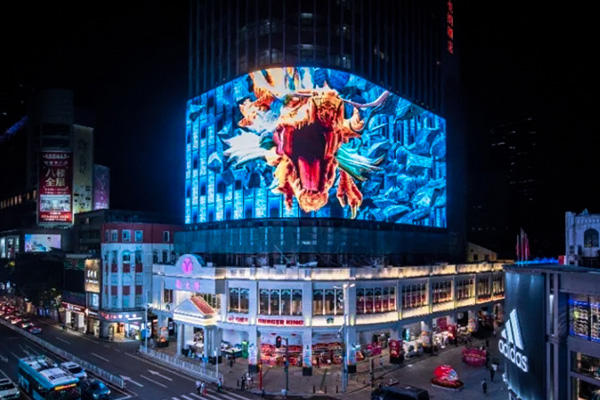 此次項目坐落于北京路新大新百貨大樓,由雷曼康碩展出品,1200㎡全國超大裸眼3D戶外8K超高清LED曲面屏,展現的3D效……