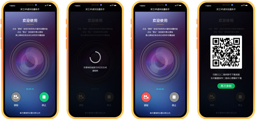 3.錄制和下載功能:該移動端小程序提供開始錄制和停止錄制的功能,用戶可以在停止錄制后通過掃描生成的視頻鏈接二維碼下載自己的xR虛擬拍攝視頻,方便隨時回顧和分享自己的xR虛擬拍攝體驗。