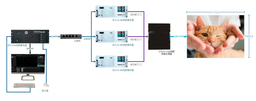 該項(xiàng)目為超大分辨率LED項(xiàng)目,分辨率為:9216×8448px,采用的是3臺(tái)深工S4-UHD視頻服務(wù)器級(jí)聯(lián),輸出12路4K信號(hào)至S72G72視頻拼接處理器再轉(zhuǎn)出為42路DVI信號(hào),視頻播放與聲光電協(xié)同控制。