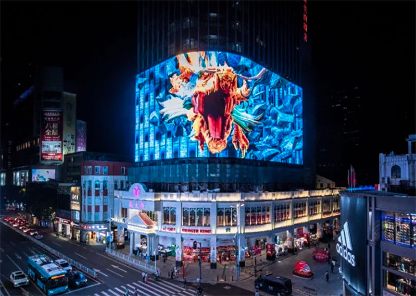 此次項(xiàng)目坐落于北京路新大新百貨大樓,由雷曼康碩展出品,1200㎡全國超大裸眼3D戶外8K超高清LED曲面屏,展現(xiàn)的3D效果可謂是驚彩絕艷,讓人忍不住停下腳步去欣賞。