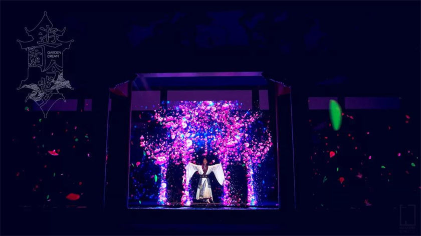 《游園·今夢(mèng)》由G20主創(chuàng)團(tuán)隊(duì)集合中國(guó)青年藝術(shù)家和技術(shù)人員,在江西省大余牡丹亭公園創(chuàng)作的一場(chǎng)“奇幻的造夢(mèng)”。借助建筑與庭院物理空間,通過數(shù)字影像與建筑光影的重新切割,構(gòu)建出《牡丹亭》的作者、作品、與觀眾之間在三層異度空間中的探索對(duì)話。