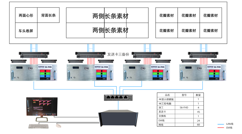 4臺(tái)S6-FHD視頻服務(wù)器作為播放端,由一臺(tái)控制電腦控制,彩車分為六瓣花,左索橋,右索橋,車尾,車頭浪花和車頂心型屏幕6個(gè)部分組成,由四臺(tái)S6-FHD分區(qū)域播控。