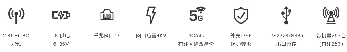 RS232/485接口:1個 SIM卡插槽:1個 天線接口:8個(內置) 指示燈:4個 DC供電接口:1個 復位鍵:1個 |